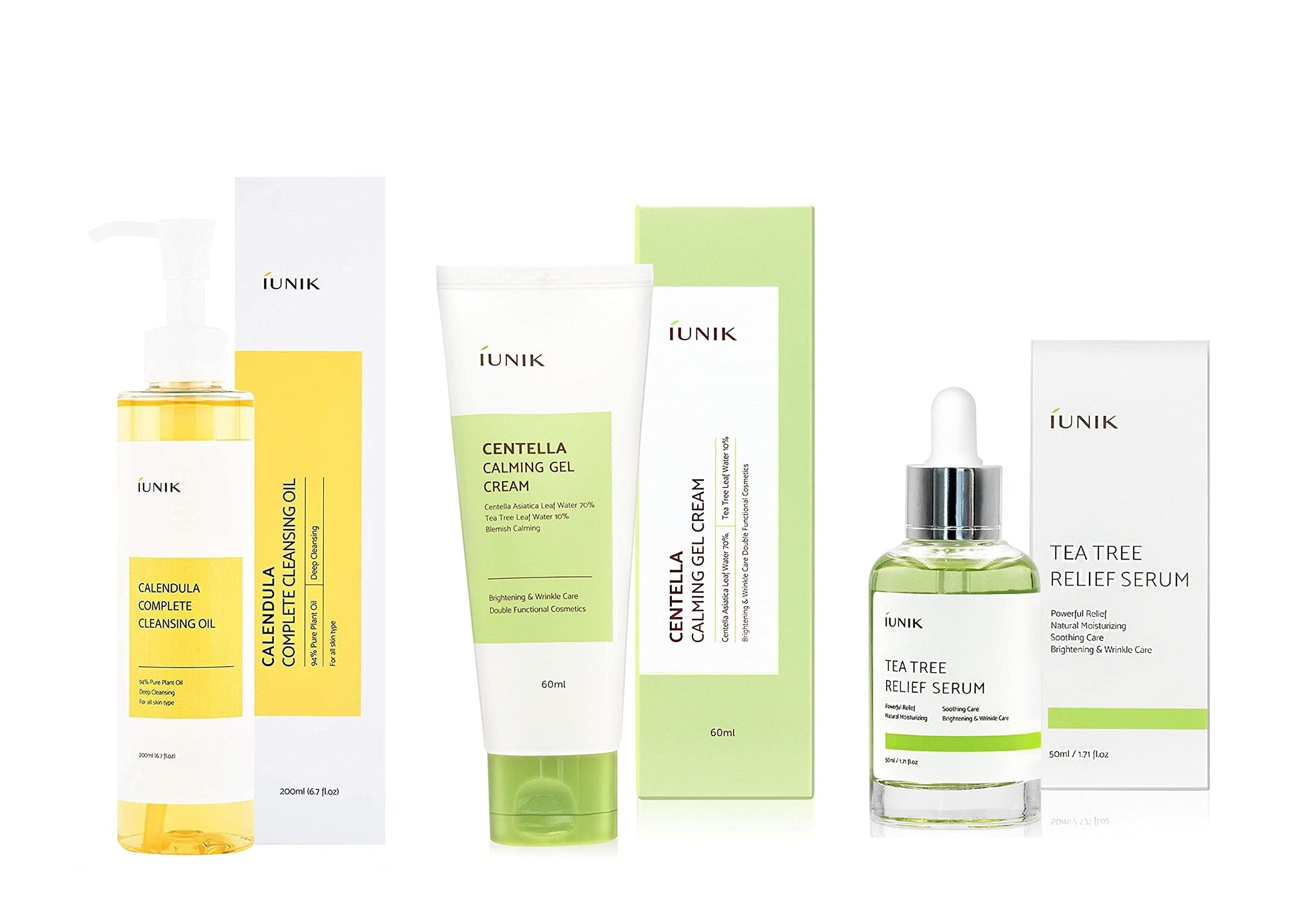 iUNIK Calendula Complete Cleansing Oil, 200ml + iUNIK Tea tree Relief Serum 50ml + iUNIK Centella Calming Gel Cream 60ml